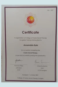 - 2021-ben integrált kranioszakrális terapeuta vizsgát tettem, Thoma Attlee iskolájában, 2 éves tanulás után.