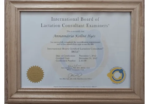 - 2012-ben a Semmelweis Egyetem laktációs szaktanácsadói vizsgára felkészítő, szakirányú képzésén szereztem másoddiplomát és tettem sikeres nemzetközi IBCLC vizsgát. Ezt 2017-ben és 2022-ben megújítottam.